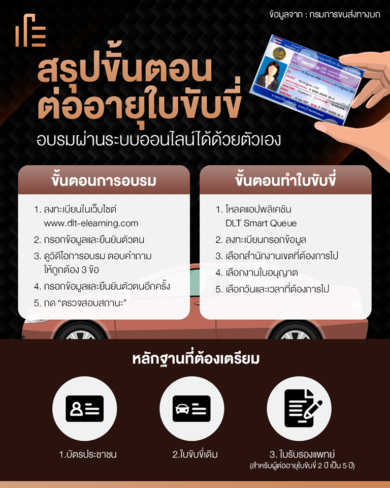 โดยผู้ขับขี่สามารถอบรมเพื่อขอต่ออายุใบอนุญาตขับรถทุกชนิดผ่านระบบ e-Learning ได้ทาง www.dlt-elearning.com ซึ่งรองรับทั้งสมาร์ทโฟน แท็บเลต และคอมพิวเตอร์ โดยมีขั้นตอนดังต่อไปนี้