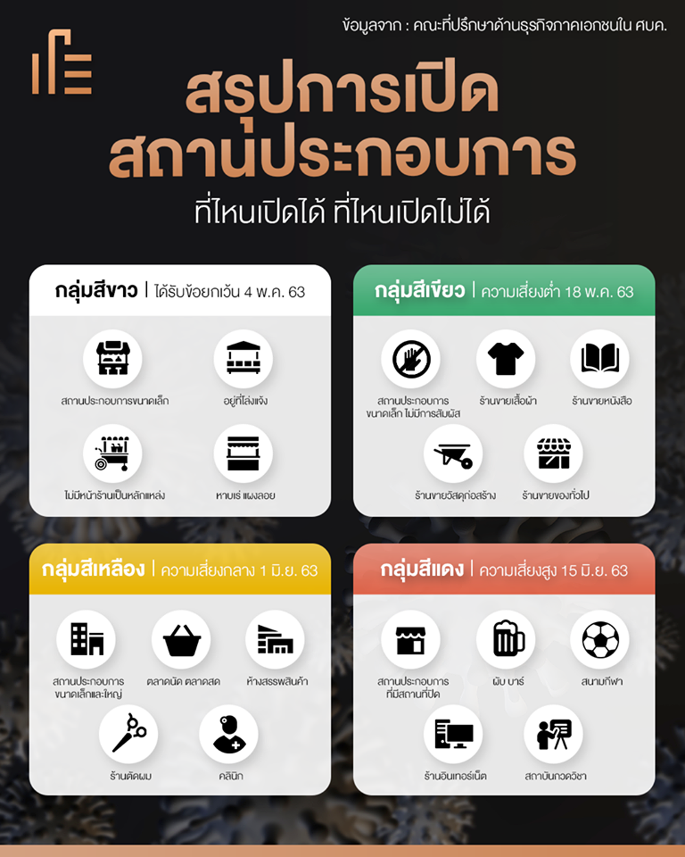 นพ.ทวีศิลป์ วิษณุโยธิน โฆษกศูนย์บริหารสถานการณ์การแพร่ระบาดของโรคติดเชื้อไวรัสโคโรนา 2019 (ศบค.) เปิดข้อมูลของคณะที่ปรึกษาด้านธุรกิจภาคเอกชน ใน ศบค. ถึงแผนแนวทางการผ่อนปรนในภาคธุรกิจต่างๆ หลังจากการประกาศขยายเวลา พ.ร.ก. ฉุกเฉินอีก 1 เดือน ซึ่งแบ่งประเภทธุรกิจออกมาเป็น 4 สี ประกอบด้วย สีขาว, สีเขียว, สีเหลือง และสีแดง เพื่อจัดแบ่งเกณฑ์ระดับความเสี่ยงของสถานประกอบการ