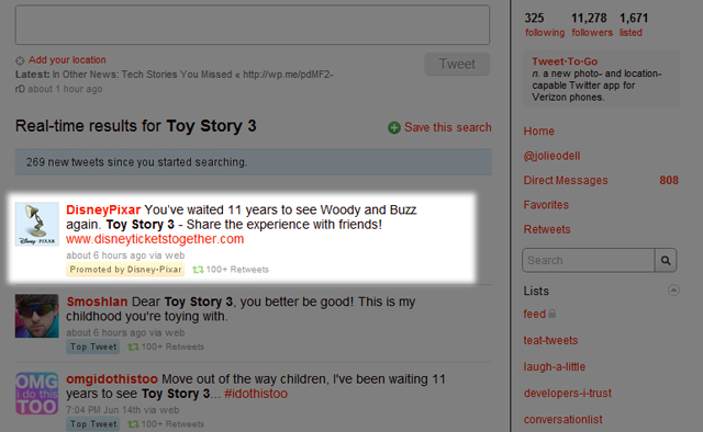 Promoted Trend นั้นเป็นบริการที่แบรนด์หรือบริษัทจะสามารถซื้อคำ hashtag (ป้ายคำหลังเครื่องหมาย #) ที่ต้องการเพื่อให้ Twitter ติดไว้ที่ส่วนบนสุดของรายการ trending topic หรือหัวข้อเรื่องที่ถูกกล่าวถึงบน Twitter มากที่สุดในขณะนั้น ผู้ใช้ที่คลิกบน hashtag นี้จะสามารถเห็นข้อความ tweet จากบริษัทที่ต้องการลงโฆษณาปรากฏที่ส่วนบนสุดของเพจรวมข้อความเกี่ยวกับ hashtag นั้น ซึ่งที่ผ่านมา แบรนด์ใหญ่อย่าง Coke, Disney (ในภาพด้านล่าง) และ Hyundai ล้วนเป็นลูกค้าบริการ promoted trend มานานหลายปี รวมถึงประธานาธิบดี Obama และอดีตผู้ท้าชิงอย่าง Romney ก็เคยเป็นลูกค้า Twitter ในช่วงศึกการเลือกตั้งประธานาธิบดีสหรัฐฯปี 2012 ถ้วนหน้า