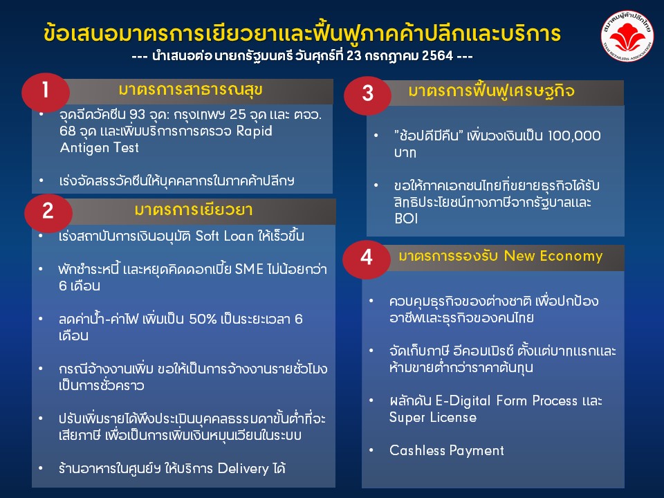 ในขณะที่การฉีดและกระจายวัคซีนยังไม่เป็นไปตามเป้า ยิ่งส่งผลกระทบต่อความเชื่อมั่นของประชาชนและภาคธุรกิจเป็นอย่างมาก จึงมีความจำเป็นที่รัฐบาลควรเร่งเยียวยากลุ่มที่ได้รับความเดือดร้อนและฟื้นฟูเศรษฐกิจอย่างเร่งด่วน โดยสมาคมฯ ขอนำเสนอ 4 มาตรการ ดังนี้