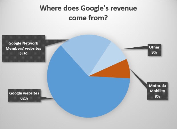 มาถึงฝั่งของ Google ยักษ์ใหญ่ด้านบริการค้นหาที่ขยายไปสู่ผลิตภัณฑ์และบริการอื่นๆ อีกมากมาย เดิมทีนั้นรายได้จากโฆษณาถือเป็นสัดส่วนถึง 97% ของรายได้ทั้งหมดของบริษัท ก่อนที่จะเริ่มมีสัดส่วนที่ลดลงเนื่องจากรายได้จากแอปพลิเคชันและรายได้จากฮาร์ดแวร์ (หลังจากที่ได้เข้าซื้อกิจการ Motorola Mobiliry) ได้ขยายตัวขึ้น แต่ก็ยังถือเป็นสัดส่วนที่น้อยมาก และหลังจากนี้ที่ Google ตัดสินใจขาย Motorola ให้กับ Lenovo แล้ว สัดส่วนน่าจะกลับไปใกล้เคียงกับรูปแบบเดิมที่มีโฆษณาสูงกว่า 90% ของรายได้ทั้งหมด