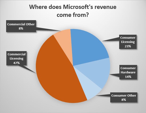 สุดท้ายปิดกันที่ Microsoft ซึ่งวิธีการรับรู้รายได้แตกต่างจาก Apple และ Google ทำให้เปรียบเทียบได้ค่อนข้างยาก แต่โดยคร่าวๆ ก็คือรายได้ก้อนใหญ่ที่สุดของบริษัทมาจากผลิตภัณฑ์ซอฟต์แวร์และบริการในตลาดองค์กร (Enterprise) ซึ่งถูกแสดงด้วยส่วนสีส้ม โดย Commercial Licensing รวมถึง Windows Server, Volume Licensing editions of Windows และ Office สำหรับองค์กร ส่วน Commercial Other รวมถึงหลายๆ บริการ เช่น Windows Azure และ Office 365 สำหรับองค์กร ส่วนผลิตภัณฑ์และบริการอื่นๆ สำหรับผู้บริโภคทั่วไปจะตกอยู่ในส่วนสีฟ้าที่เหลือ