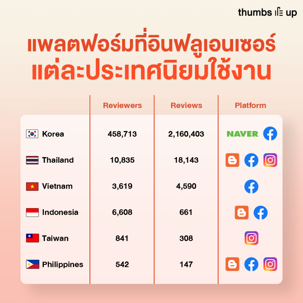 ทางด้านของแพลตฟอร์มที่เหล่าอินฟลูเอนเซอร์ในแต่ละประเทศนิยมใช้งาน สำหรับประเทศไทยยังคงเป็นโซเชียลมีเดียยอดนิยมอย่าง Facebook Blog และ Instargram ซึ่งความนิยมในแพลตฟอร์มของแต่ละประเทศจะคล้ายคลึงกันคือเน้นโซเชียลมีเดียเป็นหลัก แต่หากต้องการให้ค้นหาเจอ คือควรทำบล็อก เพราะการค้นหาผ่าน Google นั้น ยังต้องผ่าน Keyword และ SEO หากคนที่อยากเป็นอินฟลูเอนเซอร์จึงควรทำบล็อกและโซเชียลมีเดียควบคู่กันไป