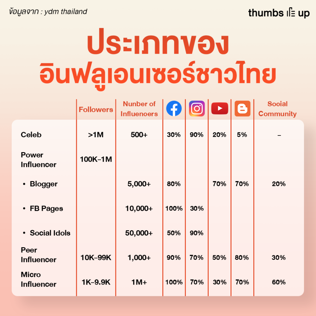 แม้ว่าแบรนด์ส่วนใหญ่จะนิยมใช้งานพรีเซนเตอร์ แต่ในช่วงปลายปีที่แล้วจนถึงปีนี้ พบว่า จำนวนของไมโครอินฟลูเอนเซอร์เติบโตขึ้นเร็วมาก เพราะคนยุคนี้จะใช้การค้นหาผ่าน Google และอ่านข้อความรีวิวจำนวนมาก เมื่อเชื่อในการรีวิวที่สมจริงแล้วก็จะตัดสินใจซื้อ ทำให้ในปีที่ผ่านมา ภาพรวมของอินฟลูเอนเซอร์ไทยเพิ่มขึ้นถึง 60% ซึ่งส่วนใหญ่จะรีวิวผ่าน Facebook ทั้งสิ้น