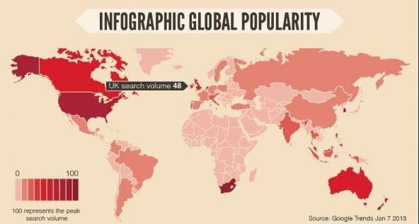 ความนิยมในการใช้งานอินโฟกราฟิกสามารถดูได้จากยอดเสิร์ชของ Google ในปี 2012 ที่ผ่านมาพบว่ายอดค้นหาคำว่า ?Infographic? เพิ่มสูงขึ้นจากเดิมในปี 2011 ถึง 5 เท่า โดยการใช้งานอินโฟกราฟฟิกได้รับความนิยมอย่างมากในประเทศแถบอเมริกาเหนือ เช่น สหรัฐฯ แคนาคา รวมไปถึงประเทศออสเตรเลียและแอฟริกาใต้ ในขณะที่ประเทศแถบเอเชียอย่างบ้านเราเริ่มมีการใช้อินโฟกราฟฟิกให้พบเห็นเพิ่มมากขึ้นแต่ก็ยังไม่เป็นที่แพร่หลายมากนัก