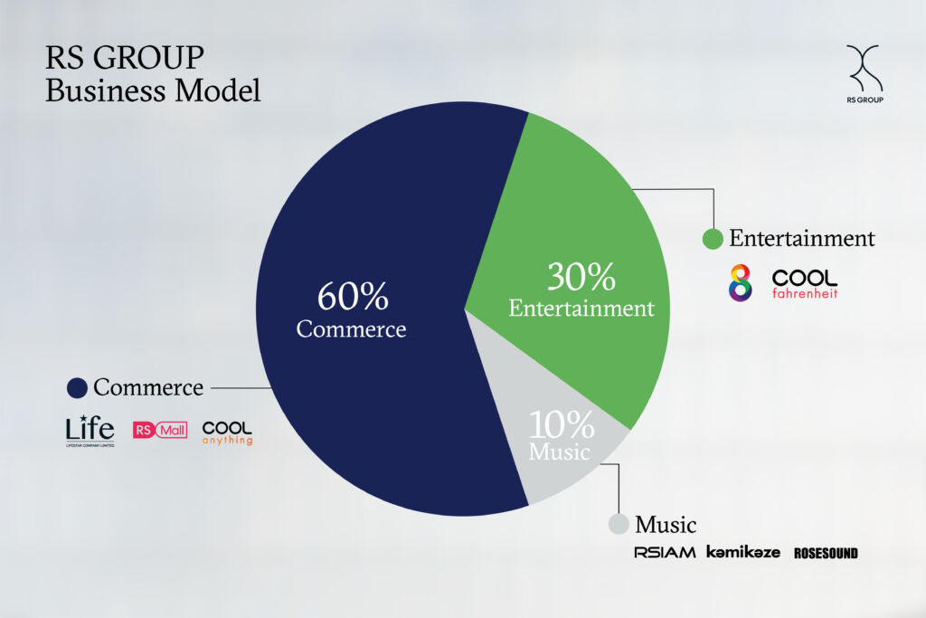 - 10% จากธุรกิจ Music ผลิตเพลงผ่านค่าย RSiam และ Kamikaze ซึ่งรายได้หลักมาจากการบริหาร asset ทั้งหมด อาทิ การฟังเพลงผ่านระบบดิจิทัล การบริหารศิลปินในค่าย การขายลิขสิทธิ์เพลง รวมถึงการจัด event และ concert