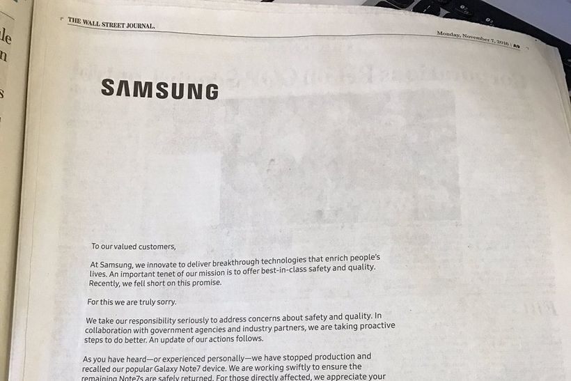 ถือเป็นหนึ่งในแผนกู้ภาพลักษณ์แบรนด์ Samsung สำหรับการลงประกาศขออภัยแบบเต็มหน้าหนังสือพิมพ์กับ Wall Street Journal, New York Times และ The Washington Post โดยเนื้อหาหลักเป็นไปตามความคาดหมายเรื่องการเน้นสร้างความมั่นใจว่า Samsung จะยึดมั่นในความปลอดภัย ท่ามกลางเสียงวิจารณ์ตลกร้ายว่า โฆษณาขออภัยอาจเป็นอนาคตของสิ่งพิมพ์ เพราะไม่ว่ากี่แบรนด์ ก็จะใช้วิธีลงโฆษณาหนังสือพิมพ์ขอโทษเต็มหน้าทั้งนั้น