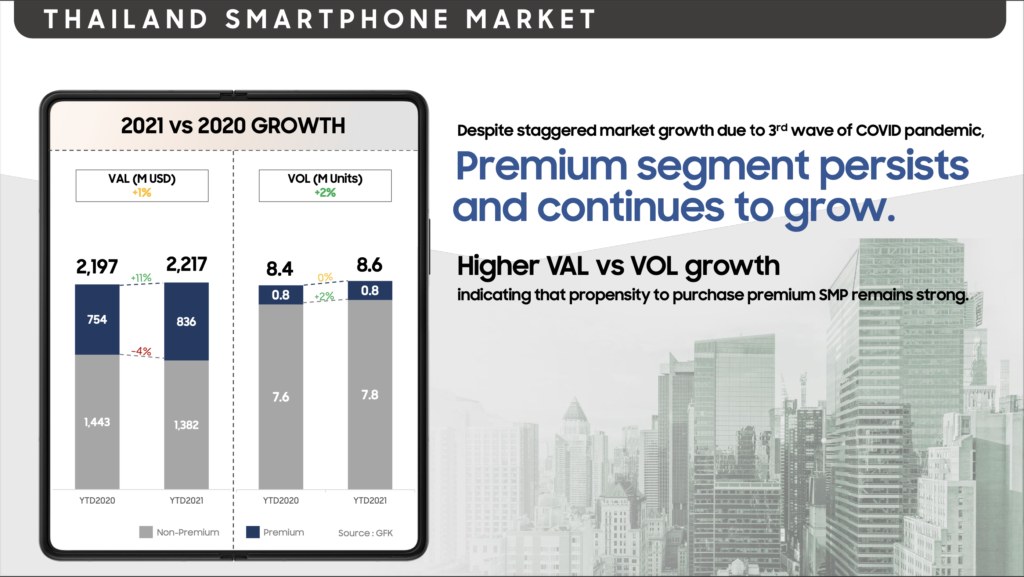 ในช่วงครึ่งปีแรกของ 2564 ซัมซุงได้ทำการสำรวจตลาดสมาร์ทโฟนในประเทศไทย และค้นพบว่าตลาดอยู่ในภาวะทรงตัว ขณะเดียวกับที่ตัวเลขของสมาร์ทโฟนในกลุ่มพรีเมี่ยมเซกเมนต์กลับสวนทางตลาด ด้วยอัตราการเติบโตเชิง มูลค่าที่เพิ่มขึ้นถึง 11% ในขณะที่อัตราการเติบโตเชิงปริมาณเพิ่มขึ้นเพียง 1% เมื่อเทียบกับปีก่อนหน้า ซึ่งตัวเลขดังกล่าวสามารถสะท้อนให้เห็นว่าผู้บริโภคชาวไทยพร้อมที่จะซื้อผลิตภัณฑ์พรีเมี่ยม หากผลิตภัณฑ์นั้นมีนวัตกรรมที่ดีและตรงกับความต้องการ