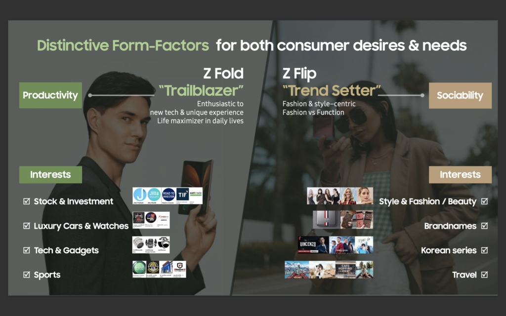 อาทิ การดึงศิลปินไอดอลเกาหลีวง BTS ที่มีชื่อเสียงโด่งดังไปทั่วโลกมาเป็นแบรนด์แอมบาสเดอร์ พร้อมทำมิวสิควิดีโอพิเศษเพื่อการเปิดตัว Galaxy Z Flip3 5G โดยเฉพาะ หรือการพาร์ทเนอร์กับอินฟลูเอนเซอร์ในไทยให้มาร่วมถ่ายทอดประสบการณ์การใช้งานสมาร์ทโฟนหน้าจอพับได้ในแบบของตนเอง ด้วยเป้าหมายที่จะให้สมาร์ทโฟนหน้าจอพับได้กลายเป็นสมาร์ทโฟนกระแสหลักมากกว่าเดิม