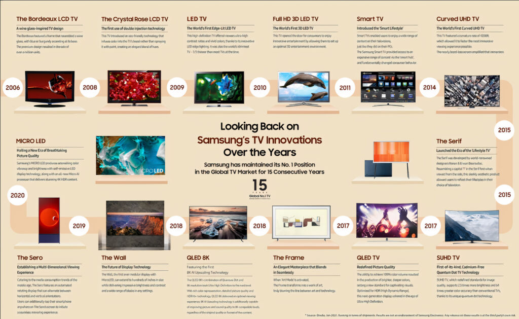 หากย้อนกลับไปในปี 2552 ซัมซุงนำเสนอเทคโนโลยีทีวี LED นวัตกรรมแหล่งกำเนิดแสงอัจฉริยะที่สร้างปรากฏการณ์ใหม่ในกลุ่มผลิตภัณฑ์ทีวี ต่อมาในปี 2560 ซัมซุงสร้างมาตรฐานใหม่ให้แก่อุตสาหกรรมทีวีอีกครั้งด้วยทีวี QLED ที่เนรมิตสีสันเต็มอิ่มแม่นยำทุกองศาได้อย่างสมบูรณ์แบบเป็นเจ้าแรกในตลาด รวมถึงเทคโนโลยี Quantum Dot ที่ให้สีสมจริงกว่าทีวีแบบเก่า พร้อมมีความเสถียรและแสงที่เจิดจ้าเต็มตา