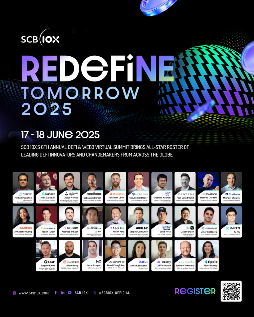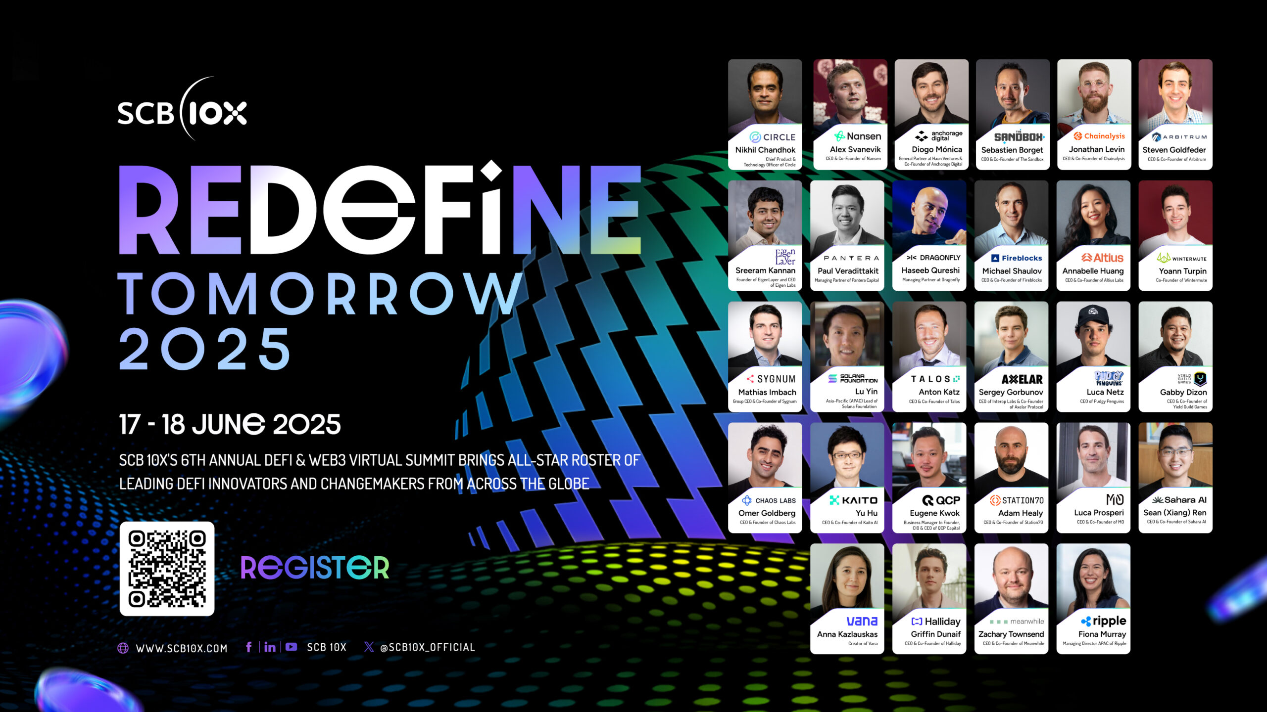 เอสซีบี เท็นเอกซ์ (SCB 10X) บริษัทด้านการลงทุนในเทคโนโลยีเปลี่ยนโลก (Disruptive Technology)ในกลุ่มเอสซีบี เอกซ์ (SCBX Group) ประกาศจัดงานสัมมนาออนไลน์ประจำปีระดับโลก “REDeFiNE TOMORROW 2025: DeFi & Web3 Virtual Summit” ครั้งที่ 6 ซึ่งจะจัดขึ้นระหว่างวันที่ 17–18 มิถุนายน 2568 ตั้งแต่เวลา 08.00–18.00 น. โดยผู้สนใจทั้งในประเทศไทยและทั่วโลกสามารถเข้าร่วมรับชมได้ฟรี