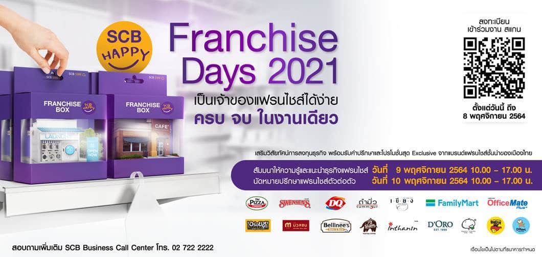จึงขอเชิญชวนผู้สนใจร่วมงาน SCB Happy Franchise Days 2021 เพื่อสร้างอาชีพและสร้างรายได้ที่มั่นคง โอกาสดีทั้งสำหรับนักลงทุนรุ่นใหม่ที่ยังไม่มีประสบการณ์ ผู้ประกอบการที่มีธุรกิจหลักอยู่แล้วแต่ต้องการขยายไปทำธุรกิจอื่นๆ รวมทั้งมนุษย์เงินเดือนที่ต้องการมีอาชีพเสริม โดยกิจกรรมทั้งหมดไม่มีค่าใช้จ่ายแต่อย่างใด