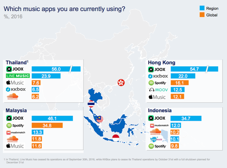 ในขณะที่ Spotify และ Apple Music ได้รับความนิยมในโลก แต่ผู้ให้บริการสัญชาติเอเชียอย่างบริการ Joox เครือ Tencent กลับกินรวบเบอร์ 1 ในตลาดอาเซียน โดย KKBox และ Yonder ก็มีตัวเลขการเติบโตที่น่าสนใจ ผลจากเพลงท้องถิ่นรวมถึงประสบการณ์การใช้งานที่คนเอเชียคุ้นเคย