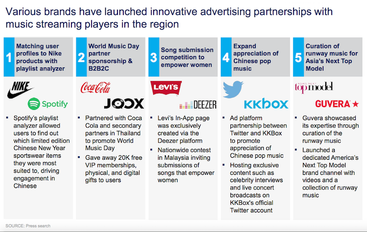 อย่างไรก็ตาม McKinsey พบว่าชาวเอเชียบางส่วนยังไม่อยากเสียเงินสมัครค่าบริการเพลงออนไลน์ ขณะที่บางกลุ่มยังใช้โทรศัพท์ที่ไม่รอบรับ จุดนี้ทำให้ McKinsey มองว่านี่คือโอกาสที่แบรนด์จะจับมือกับบริการเหล่านี้ เพื่อให้บริการเพลงพ่วงโฆษณา ตัวอย่างที่ชัดเจนคือ Coca-Cola ที่เป็นสปอนเซอร์จัดงาน World Music Day กับ Joox จนได้รับเสียงตอบรับล้นหลาม