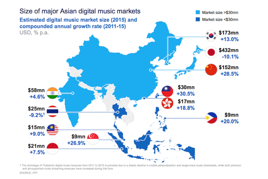 การเติบโตที่มากกว่า 20 เท่าตัวนั้นเทียบจากตัวเลขเฉลี่ยทั่วโลกในช่วง 4 ปีที่ผ่านมา ซึ่งแม้เอเชียจะมีส่วนแบ่งราว 14% ของรายได้จากธุรกิจเพลงดิจิทัลทั่วโลก แต่ McKinsey พบว่าตลาดเอเชียกำลังขยายตัวต่อเนื่อง เนื่องจากเป็นพื้นที่พำนักของผู้ใช้อินเทอร์เน็ต 44% ของทั้งหมดในปี 2015 และเป็นเจ้าของ GDP โลกราว 25% จากการสำรวจเมื่อปี 2013