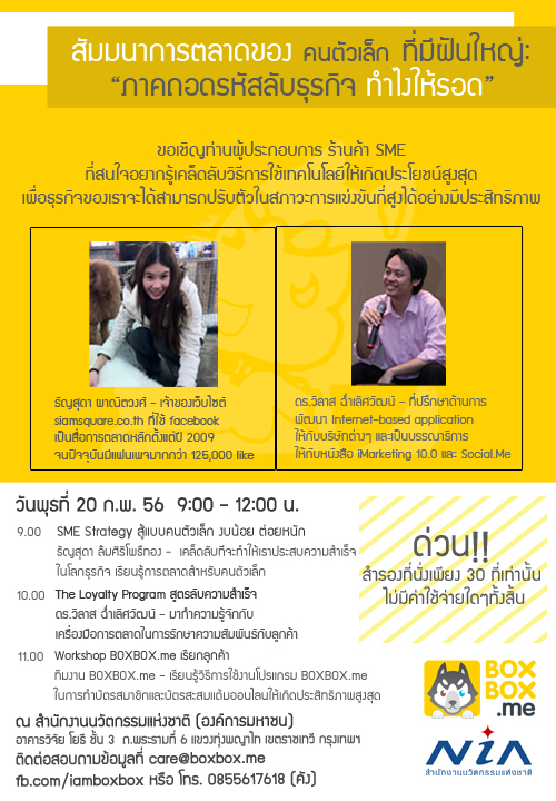 เตรียมพบกับสัมมนาการตลาดของคนตัวเล็ก ที่มีฝันใหญ่:?ภาค ถอดรหัสลับธุรกิจ ทำไงให้รอด ในวันพุธที่ 20 ก.พ. 56 เวลา 9:00 ? 12:00 น.ณ สำนักงานนวัตกรรมแห่งชาติ (องค์การมหาชน)?อาคารวิจัย โยธี ชั้น 3 ถ.พระรามที่ 6 แขวงทุ่งพญาไท เขตราชเทวี กรุงเทพฯ