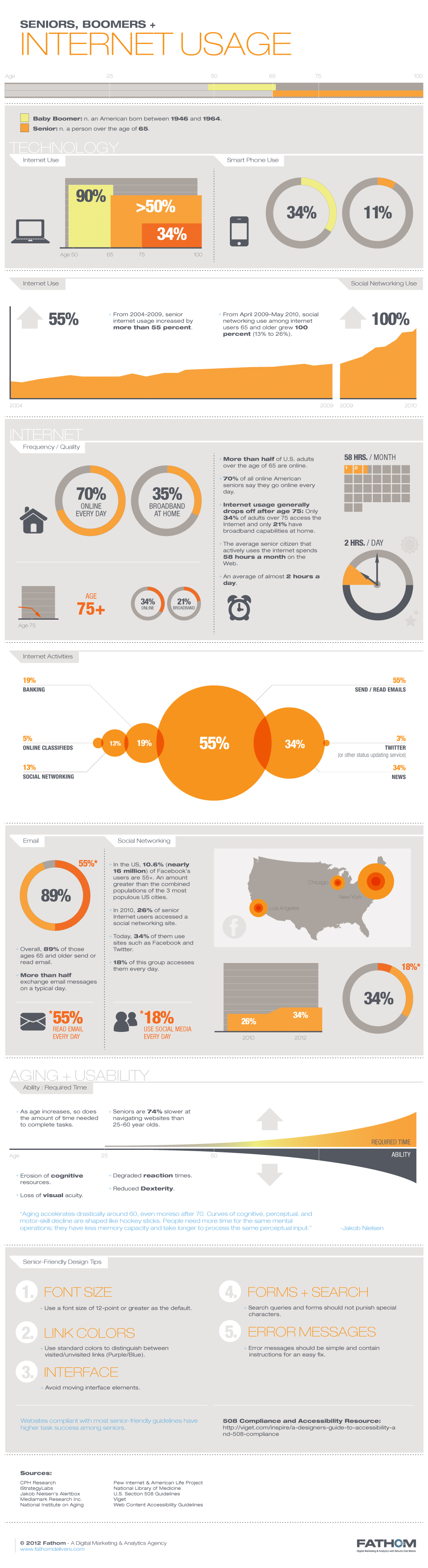 Fathom นำข้อมูลสำรวจการใช้งานอินเทอร์เน็ตในกลุ่มผู้สูงอายุชาวอเมริกันที่มีอายุตั้งแต่ 50 ปีขึ้นไปจนถึง 100 ปีมาวิเคราะห์ จนพบว่าผู้ใช้งานส่วนใหญ่มีอายุเฉลี่ยอยู่ที่ 55-65 ปี ซึ่งเป็นการใช้งานผ่านคอมพิวเตอร์และโทรศัพท์สมาร์ทโฟนเป็นหลัก โดยการใช้งานผ่านคอมพิวเตอร์มีจำนวนอยู่ที่ 90% และการใช้งานผ่านสมาร์ทโฟนมีจำนวน 34%