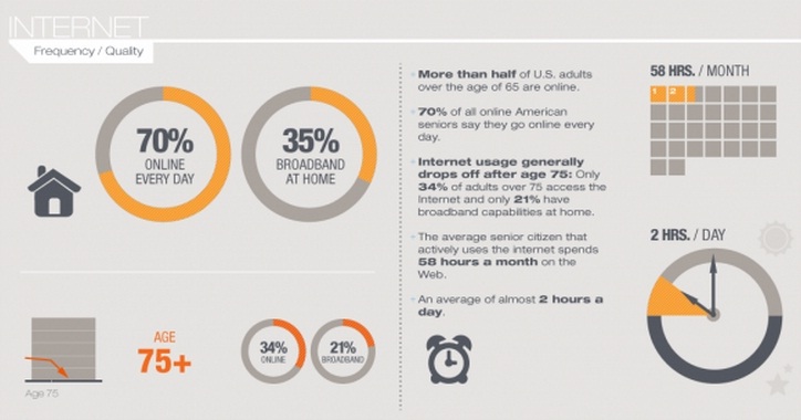 ระยะเวลาในการใช้งานอินเทอร์เน็ตของผู้สูงอายุชาวอเมริกันส่วนใหญ่เฉลี่ยอยู่ที่ 2 ชั่วโมงต่อวันหรือราว 58 ชั่วโมงต่อ 1 เดือน และยังมีผู้สูงอายุอีกกว่า 70% ที่ออนไลน์เป็นประจำทุกวันอีกด้วย โดยกิจกรรมในกลุ่มผู้สูงอายุที่รักการออนไลน์นิยมทำกันมากที่สุดก็คือ การรับส่ง E-mail (55%) รองลงมาเป็นการติดตามข่าวสาร (34%) การทำธุรกรรมทางการเงิน (19%) การใช้เครือข่ายสังคมออนไลน์ (13%) ดูประกาศซื้อขายสินค้าออนไลน์ (5%) และการใช้งาน Twitter (3%)