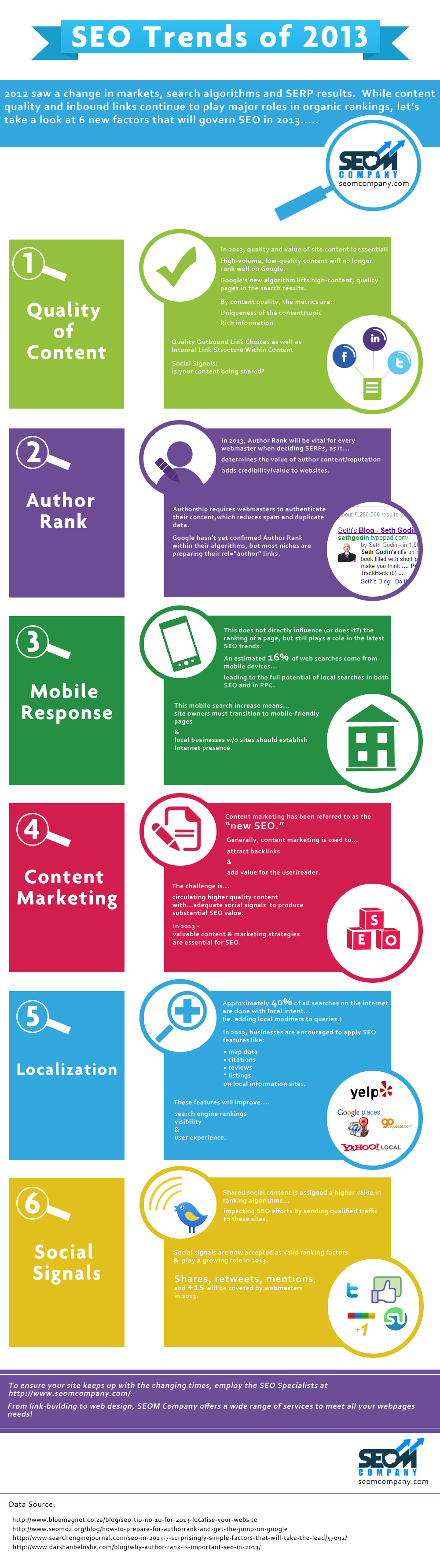 ปัจจัยแรกในการทำ SEO ที่เว็บไซต์ Seomcompany.com นำเสนอ คือคุณภาพของเนื้อหา (Quality of Content) เช่นเดียวกับปีที่ผ่านมา การจัดอันดับของเสิร์ชเอนจินในปี 2013 เน้นให้ความสำคัญกับคุณภาพของเนื้อหามาก่อนเป็นอันดับหนึ่ง โดยข้อมูลที่นำเสนอต้องเป็นเนื้อหาที่มีประโยชน์ มีคุณค่า และมีเอกลักษณ์แตกต่างจากคนอื่น