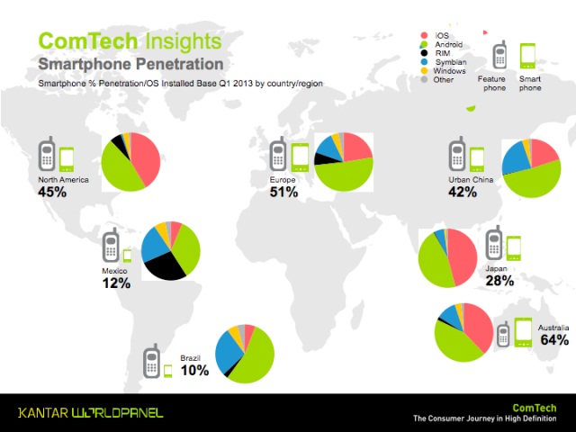 บริษัทวิจัยการตลาด Kantar ทำการสำรวจตลาดหลัก 9 แห่งของโลก ได้แก่ ออสเตรเลีย, จีน, ฝรั่งเศส, เยอรมันนี, อิตาลี, ญี่ปุ่น, สเปน, อเมริกา และอังกฤษ ซึ่งผลที่ได้ก็แสดงให้เห็นว่า Android ครองส่วนแบ่งไป 64.2% ของยอดขายอุปกรณ์พกพาในไตรมาสแรกของปีนี้