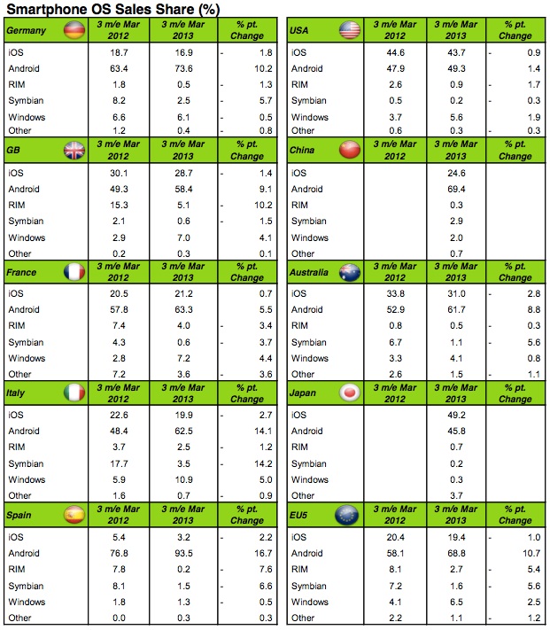 เมื่อดูจากผลสำรวจ จะเห็นว่า Android ยังคงเป็นผู้นำในด้านยอดขายในตลาดแทบทุกแห่ง ไม่ว่าจะเป็นตลาดที่พัฒนาแล้วอย่างอเมริกา, อังกฤษ และเยอรมัน หรือตลาดที่กำลังพัฒนาเช่นประเทศจีน และตลาดที่กำลังประสบปัญหาเศรษฐกิจอย่างสเปน แต่ก็ยังมีตลาดญี่ปุ่นที่ iOS ยังเป็นผู้นำอยู่ ซึ่งนับได้ว่าไม่มากเท่าไหร่เพราะในญี่ปุ่น iOS มียอดขายที่ 49.2% ส่วน Android ตามอยู่ที่ 45.8% เท่านั้น