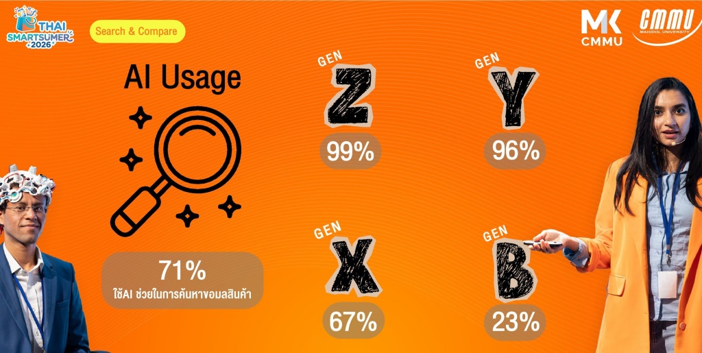 SmartSumer ไม่ใช่แค่กลุ่มวัยรุ่นที่เก่งเทคโนโลยีเท่านั้น แต่ผลวิจัยยืนยันว่าคนไทยกว่า 90% ในทุกเจเนอเรชัน ตั้งแต่ Baby Boomer ไปจนถึง Gen Z ต่างมีพฤติกรรมนี้เหมือนกันหมด โดยปัจจัยเร่งสำคัญคือแรงกดดันทางเศรษฐกิจ ราคาพลังงาน และหนี้ครัวเรือนที่เพิ่มขึ้น ทำให้ผู้บริโภคเริ่มหันมาใช้ข้อมูลและเทคโนโลยี AI เป็นเครื่องมือหลักในการตัดสินใจซื้อสินค้า เพื่อลดความเสี่ยงและเพิ่มความคุ้มค่าให้ได้มากที่สุด