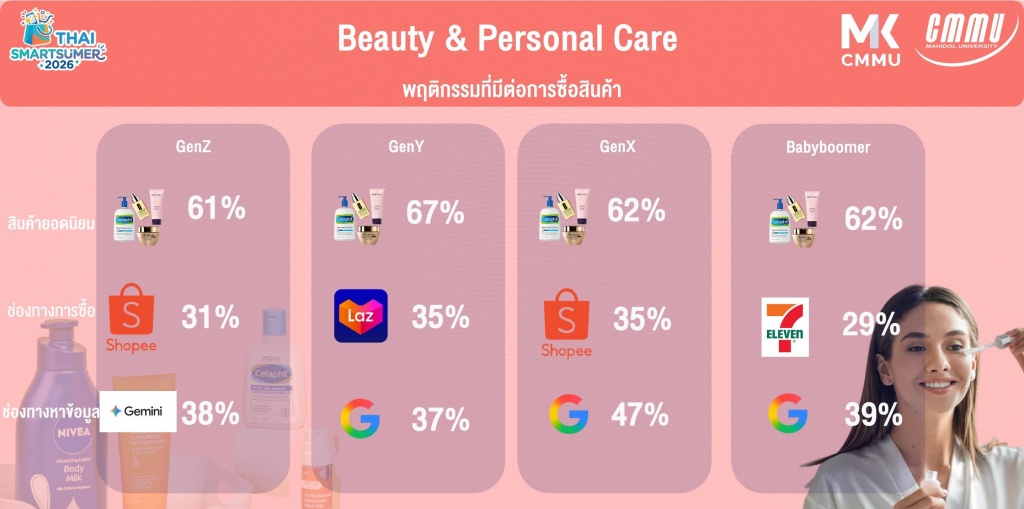 - Beauty & Personal Care: เปลี่ยนจากความเชื่อมั่นในภาพลักษณ์แบรนด์ มาเป็นการเน้นส่วนผสม กว่า 30% ใช้ AI เช่น ChatGPT หรือ Gemini ช่วยวิเคราะห์ส่วนผสมก่อนซื้อ