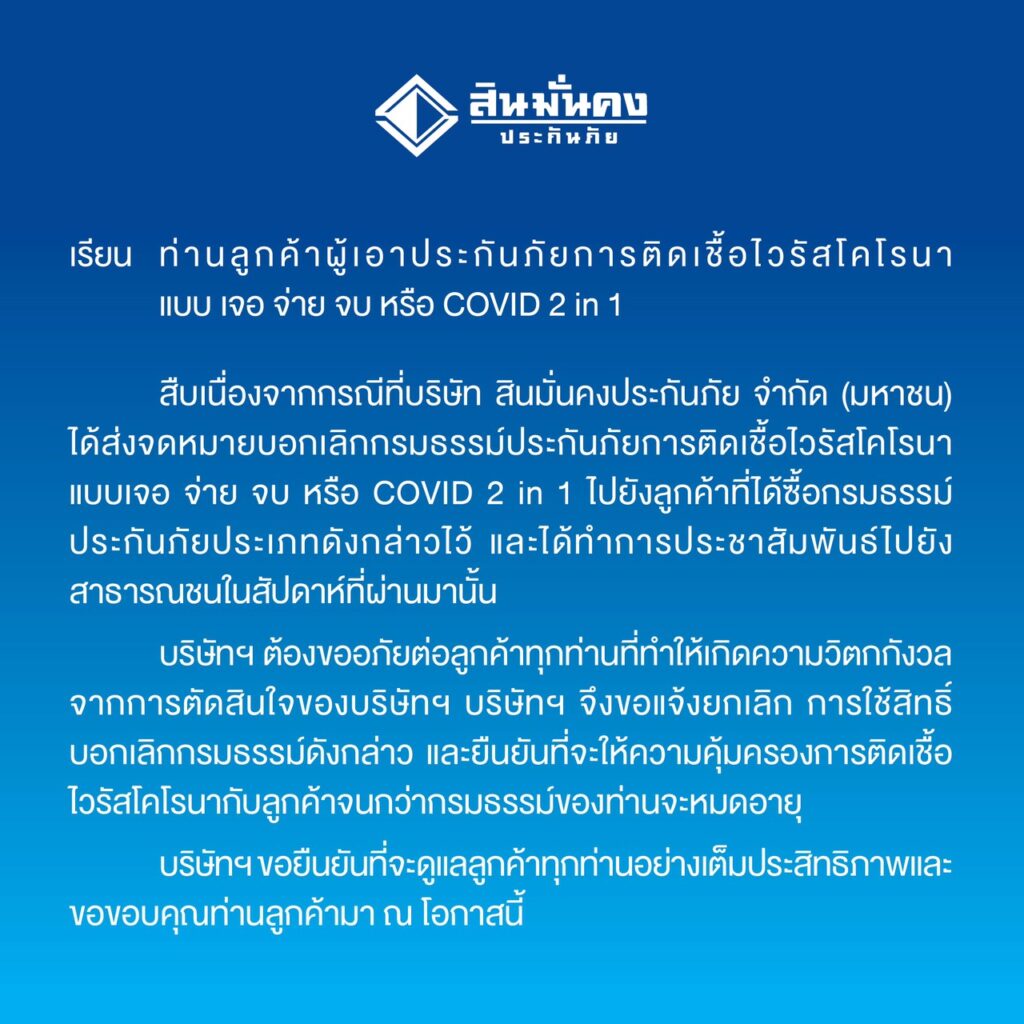 สืบเนื่องจากกรณีที่บริษัท สินมั่นคงประกันภัย จำกัด (มหาชน) ได้ส่งจดหมายบอกเลิกกรมธรรม์ประกันภัยการติดเชื้อไวรัสโคโรนา แบบเจอ จ่าย จบ หรือ COVID 2 in 1 ไปยังลูกค้าที่ได้ซื้อกรมธรรม์ประกันภัยประเภทดังกล่าวไว้ และได้ทำการประชาสัมพันธ์ไปยังสาธารณชนในสัปดาห์ที่ผ่านมานั้น