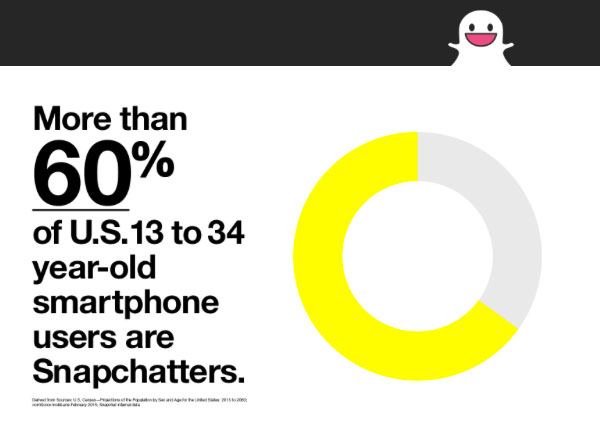 ทั้งหมดนี้ Snapchat เคลมว่า 60% ของผู้ใช้สมาร์ทโฟนอายุระหว่าง 13 ถึง 34 ปีในสหรัฐฯมีการใช้งาน Snapchat ความนิยมนี้ทำให้นักการตลาดทั่วโลกสนใจลงโฆษณากับเครือข่ายสังคมน้องใหม่ที่มีมูลค่าตลาดมากกว่า 1.9 หมื่นล้านเหรียญสหรัฐ โดยวิดีโอนับเป็นหนึ่งในคุณสมบัติสำคัญที่ทำให้ Snapchat ได้รับความนิยมยิ่งกว่าเดิม