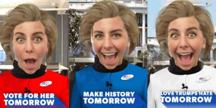 ด้วย Snapchat Lens ของฮิลลารี คลินตัน ชาว Snapchatter จะสามารถถ่ายวิดีโอตัดต่อใบหน้าตัวเองบนทรงผมและเสื้อผ้าของคลินตันแบบเรียลไทม์ โดย Snapchat Lens นี้พร้อมให้ใช้งานทั่วสหรัฐ 24 ชั่วโมงก่อนการเลือกตั้งจะเกิดขึ้น