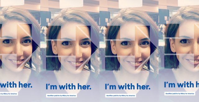 นอกจาก Snapchat Lens ทีมแคมเปญของคลินตันยังลงโฆษณาประเภท Snapchat Geofilter ซึ่งผู้ใช้สามารถถ่ายภาพนิ่งเพื่อแสดงให้เพื่อนชมว่ากำลังอยู่ที่ไหนและทำอะไร จุดนี้สำนักข่าว The Drum ให้ข้อมูลว่าโพสต์โฆษณาประเภทนี้สามารถปรากฏสู่สายตาของชาว Snapchat มากกว่า 40% ถึง 60%