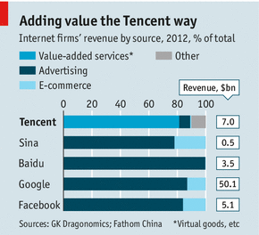 จากช่องทางของรายได้ Tencent แตกต่างจาก Google, Facebook หรือ Baidu และ Sina จากจีนด้วยกันเองอย่างสิ้นเชิง ซึ่งในขณะที่ยักษ์ใหญ่ทั้งหลายเน้นรายได้จากการโฆษณา Tencent เองผลักดันการพัฒนาและสร้างรายได้จากบริการเสริม (value-added services) เป็นหลักหรือถือเป็นกว่า 80% ของรายได้ทั้งหมด