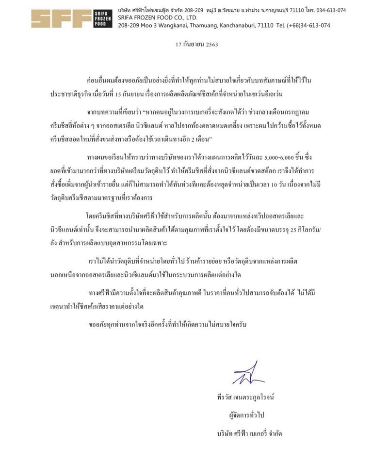 ล่าสุด บริษัทศรีฟ้าเบเกอรี่ ออกมาชี้แจงดราม่าว่าไม่ได้ตัดโอกาสผู้ค้ารายอื่นเนื่องจากเป็นการสั่งซื้อในระดับอุตสาหกรรม โดยระบุว่า “เราไม่ได้นำวัตถุดิบที่จำหน่ายโดยทั่วไป ร้านค้ารายย่อย หรือวัตถุดิบจากแหล่งการผลิตนอกเหนือจากออสเตรเลียและนิวซีแลนด์มาใช้ในกระบวนการผลิตแต่อย่างใด”
