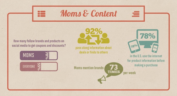 โดยผลสำรวจพฤติกรรมในการซื้อสินค้าพบว่า 44% ของคุณแม่ชาวอเมริกันในปัจจุบันตัดสินใจซื้อสินค้าตามคำแนะนำของเพื่อนที่โพสบนโซเชียลมีเดีย นอกจากนี้คุณแม่อีก 78% ยังนิยมตาม (Follow) แบรนด์ที่ตัวเองชื่นชอบเพื่อรับคูปองหรือส่วนลดสำหรับใช้ในการซื้อสินค้า ในขณะมีผู้ใช้งานทั่วไปเพียงแค่ 55% เท่านั้นที่ติดตามแบรนด์เพื่อรับส่วนลด