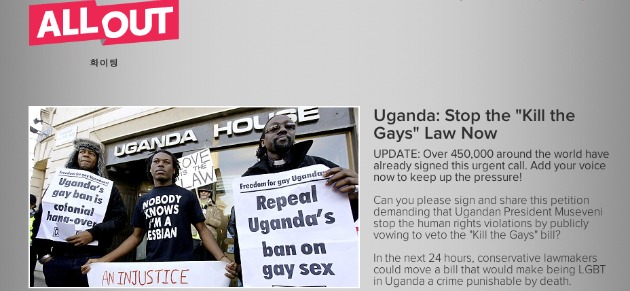 นอกจากนี้ยังพบว่าทีมงาน AllOut ไม่ได้ต่อสู้อยู่เพียงเว็บเดียว แต่ยังมี Avaaz กลุ่มนักกิจกรรมทางการเมืองยังร่วมล่ารายชื่อคนที่ต้องการต่อต้านนโยบายนี้ถึง 1.25 ล้านคน และในขณะที่ชาว Social media ต่อต้านได้ไม่นานนั้น แม้รัฐบาลยูกันดาก็ไม่ได้ออกมาโต้ตอบอะไรโดยตรง แต่ดูเหมือนว่านโยบายนี้ก็จะผ่านเข้าสภาในที่สุด โดยนโยบายต่อต้านรักร่วมเพศก็ยังคงมีอยู่เพียงแต่ยกโทษตายออกไปเท่านั้น