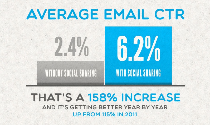 GetResponse ระบุว่าหลังจากนำเอาปุ่มแชร์บนโซเชียลมีเดียมาใช้บนอีเมลแล้วพบว่า อีเมลมีอัตราการคลิกผ่าน (CTR) ต่ออีเมลหนึ่งฉบับเพิ่มสูงขึ้นเป็น 6.2% ในขณะที่การทำ E-mail Marketing เพียงอย่างเดียวที่มีค่า CTR ต่ออีเมลหนึ่งเฉลี่ยอยู่ที่ 2.4% เท่านั้น นอกจากนี้ยังพบว่าค่า CTR โดยรวมยังเพิ่มสูงขึ้นจากเดิม 115% ในปี 2011 เป็น 158% ในปี 2012