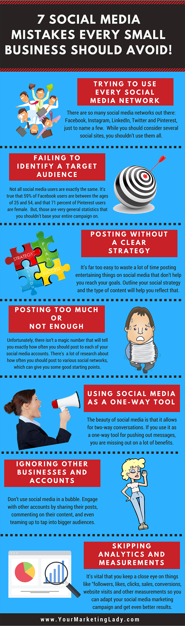 บาปข้อ 6 คือการมองข้ามความสำคัญของพันธมิตรธุรกิจอื่น ซึ่งจะทำให้ธุรกิจเสียโอกาสในการแชร์โพสต์ ซึ่งจะทำให้ไม่อาจเจาะกลุ่มเป้าหมายที่ใหญ่ขึ้นได้ สุดท้ายคือบาปที่ 7 คือการไม่ได้วัดผลแคมเปญของธุรกิจ แน่นอนว่าการเลือกปิดตาไม่รับรู้ว่ามีข้อผิดพลาดอะไรในแคมเปญโซเชียลบ้าง จะเป็นบ่อนทำลายกลยุทธ์โซเชียลมีเดียในอนาคต ดังนั้นจงติดตามคะแนนเพื่อนำไปพัฒนาต่อยอด ซึ่งมีโอกาสสูงที่จะได้ผลลัพท์ที่ดีกว่า.