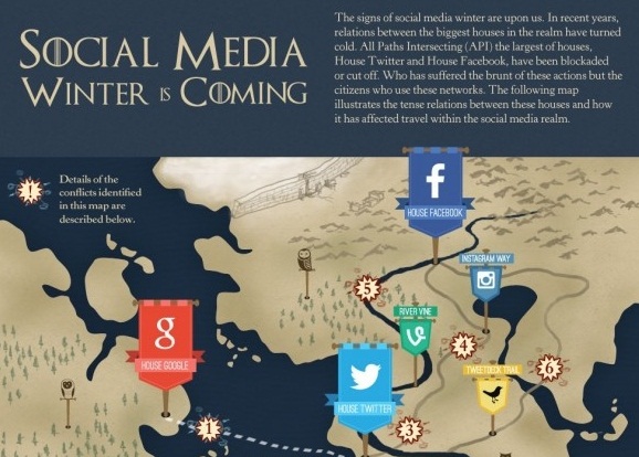 วันนี้เรื่องราวของโซเชียลมีเดียถูกบอกเล่าในรูปแบบ Infographic ที่แปลกตากว่าเดิม โดยเว็บไซต์ Hootsuite.com นำเอาเรื่องราวในแวดวงโซเชียลมีเดียโลกที่มีการแข่งขันกันอย่างดุเดือด มาประยุกต์ใช้กับธีมเรื่องจากภาพยนตร์ซีรีส์ชื่อดังในอเมริกาที่มีชื่อว่า “Game of Thrones”