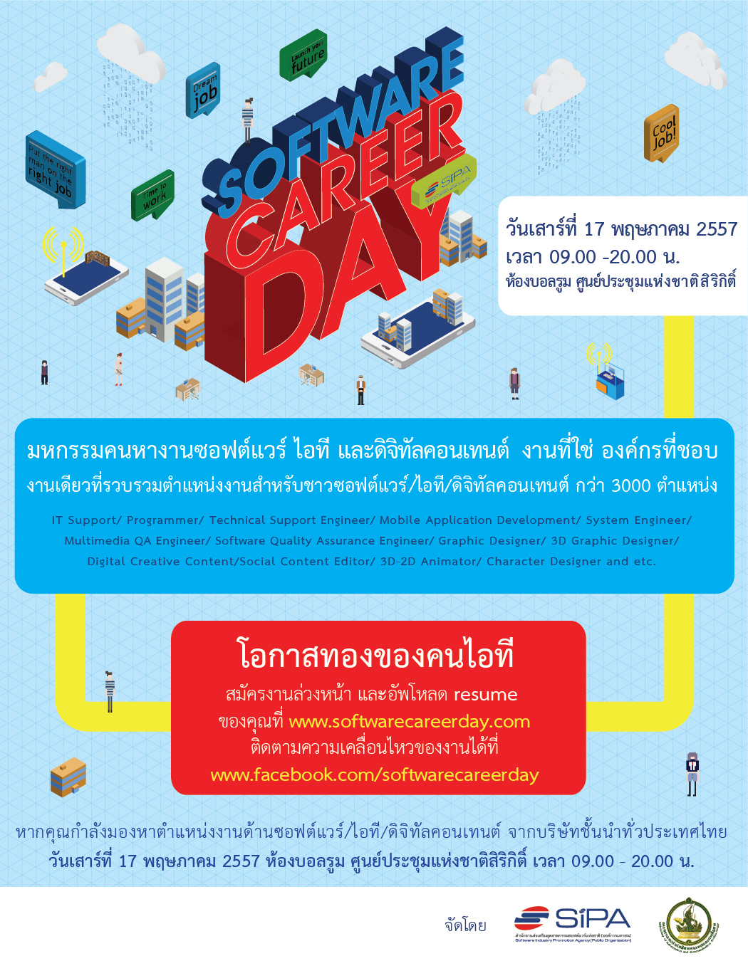 พบกับงาน Software Career Day by SIPA หรือ มหกรรมคนหางานซอฟต์แวร์ ไอที และดิจิทัลคอนเทนต์ พบกับงานที่ใช่ องค์กรที่ชอบใน วันเสาร์ที่ 17 พฤษภาคม 2557 เวลา 09.00 – 20.00 น.