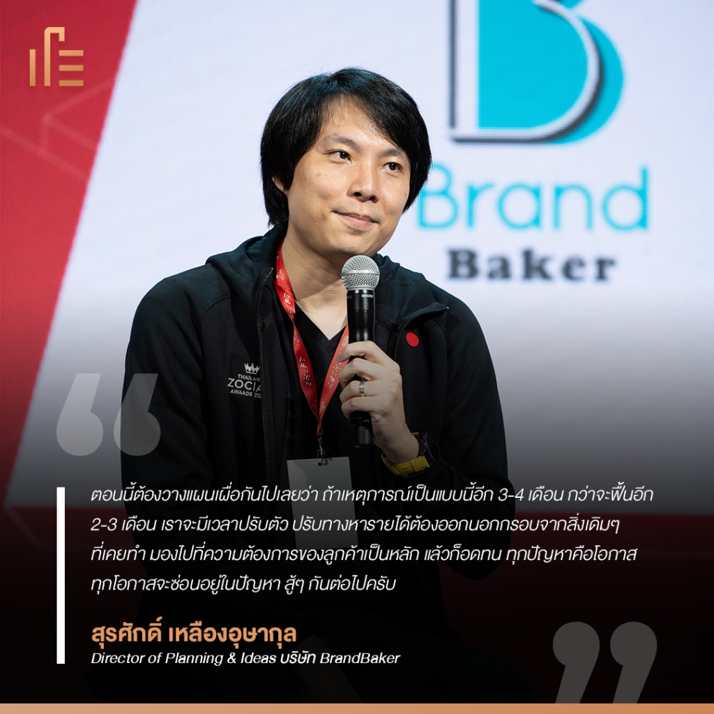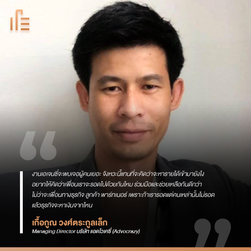 ยิ่งงานเอเจนซี่จะพบเจอผู้คนเยอะ จังหวะนี้แทนที่จะคิดว่าจะหารายได้เข้ามายังไง อยากให้คิดว่าเพื่อนเราจะรอดไปด้วยกันไหม ร่วมมือและช่วยเหลือกันดีกว่า ไม่ว่าจะเพื่อนทางธุรกิจ ลูกค้า พาร์ทเนอร์ เพราะถ้าเรารอดแต่คนเหล่านั้นไม่รอดแล้วจะหาเงินจากไหน