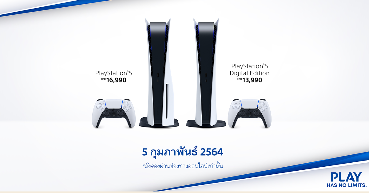 โดยวางจำหน่ายคอนโซล PS5 รุ่นมีช่องอ่านแผ่น Ultra HD Blu-ray™ ในราคา 16,990 บาท ขณะที่รุ่น Digital Edition วางจำหน่ายในราคา 13,990 บาท