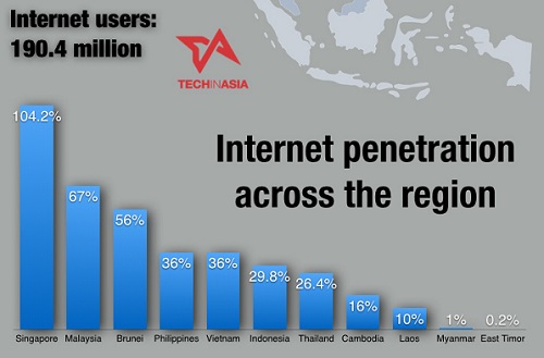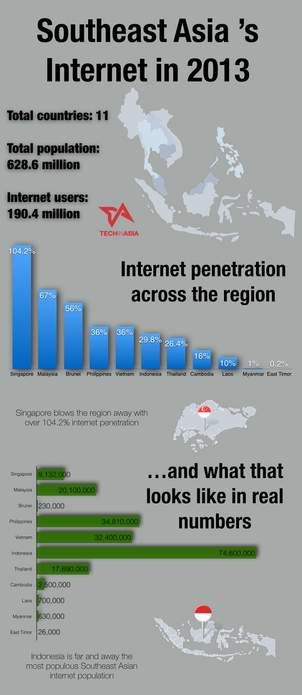 เว็บไซต์ techinasia.com เผยแพร่อินโฟกราฟฟิกบรรยายข้อมูลการใช้อินเทอร์เน็ตของชาวอาเซียนประจำปี 2013 ไว้อย่างน่าสนใจ โดยพบว่าในจำนวนประชากร 628.6 ล้านคนจาก 11 ประเทศ ผู้ใช้อินเทอร์เน็ตในภูมิภาคนี้คิดเป็น 190.4 ล้านคน โดยสิงคโปร์ครองตำแหน่งแชมป์ประเทศที่มีสัดส่วนการใช้งานอินเทอร์เน็ตต่อประชากรสูงที่สุดเกิน 100% เนื่องจากสิงคโปร์คือประเทศที่มีจำนวนประชากรไม่ถึง 10 ล้านคน แต่มีผู้ใช้อินเทอร์เน็ตมากกว่า 9.1 ล้านคน