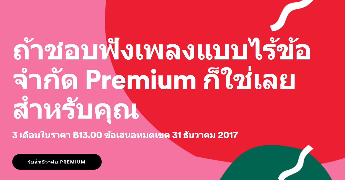การจัดโปรโมชันครั้งนี้ของ Spotify เป็นการลดราคาส่งท้ายปี โดยผู้สมัครรายใหม่สามารถเลือกแผน Premium ได้ในราคา 13 บาท (ใช้งานได้ 3 เดือน) จากนั้นค่าบริการจึงจะเพิ่มเป็นราคาปกติเดือนละ 129 บาท