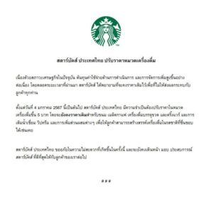 เริ่มตั้งแต่วันนี้ (4 มกราคม 2567) สตาร์บัคส์ ประเทศไทย ขึ้นราคาเครื่องดื่ม 5 บาท เนื่องด้วยราคาต้นทุนสินค้า