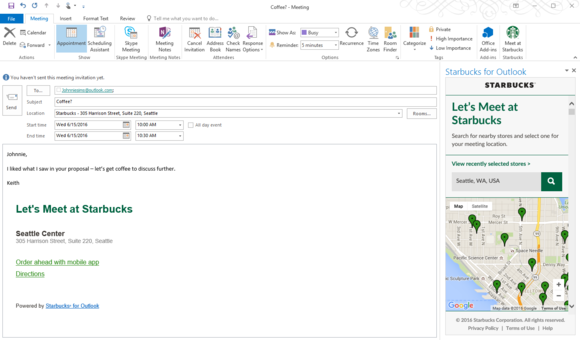 ต้องเรียกว่าเป็นมิติใหม่ที่ Starbucks และ Microsoft มาพบกันได้อย่างลงตัวบนระบบรับส่งอีเมลและนัดหมายงานอย่าง Outlook เพราะวันนี้ทั้งคู่เปิดให้ผู้ใช้ดาวน์โหลดโปรแกรมเสริม ซึ่งช่วยให้การนัดคุยงานที่ร้าน Starbucks ใกล้บ้านทำได้สะดวกกว่าเดิม