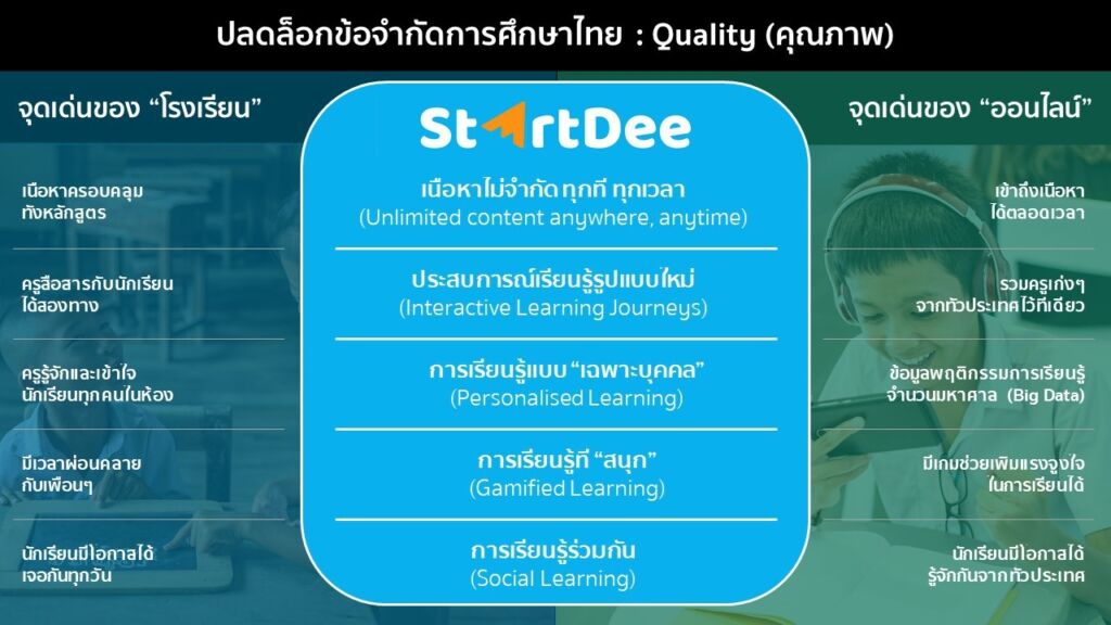 ซึ่งหากเด็กไทยทั่วประเทศกว่า 8 ล้านคน ได้รับการศึกษาที่เหมือนกัน ความเหลื่อมล้ำระหว่างคนที่รวยที่สุดกับคนที่จนที่สุด จะลดลงได้ถึง 39%(ข้อมูลจาก UNESCO) นี่จึงเป็นโจทย์ใหญ่ที่ทำให้ คุณไอติม พริษฐ์ วัชรสินธุ ผู้ก่อตั้ง และซีอีโอ บริษัท เอ็ดดูเคชั่น เทคโนโลยี จำกัด เร่งพัฒนาแอปพลิเคชันด้านการศึกษา “StartDee” ที่เปรียบเสมือน “Netflix ของการศึกษาไทย” โดยนำเทคโนโลยีมาบูรณาการ ส่งเสริม และใช้ควบคู่ไปกับการเรียนการสอนในโรงเรียน เพื่อให้เด็กนักเรียนทั่วประเทศ สามารถเข้าถึงการศึกษาที่มีคุณภาพได้อย่างทั่วถึงที่สุด และพร้อมรับมือกับอนาคตการศึกษาไทยหลังโควิด-19 ที่จะพัฒนาสู่ new normal กับพฤติกรรมการเรียนที่เปลี่ยนไป