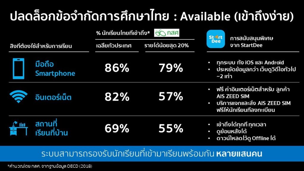 - เอไอเอส (AIS) ด้วยการนำจุดแข็งทางด้านโครงข่ายดิจิทัลพื้นฐาน (Digital Infrastructure) มาช่วยสนับสนุนอินเทอร์เน็ตเพื่อการศึกษา ร่วมพัฒนาคอนเทนต์ด้านทักษะดิจิทัล พร้อมแผนความร่วมมือระยะยาวร่วมกันในเชิงนวัตกรรม พร้อมกับร่วมสนับสนุนการเข้าถึงการศึกษาอย่างเท่าเทียมโดยการแจก “ซี้ดซิม” (ZEED SIM) ที่มากับการใช้อินเทอร์เน็ตโดยไม่เสียค่าใช้จ่ายให้กับน้องๆ ที่ใช้บริการแอปพลิเคชัน StartDee อีกด้วย