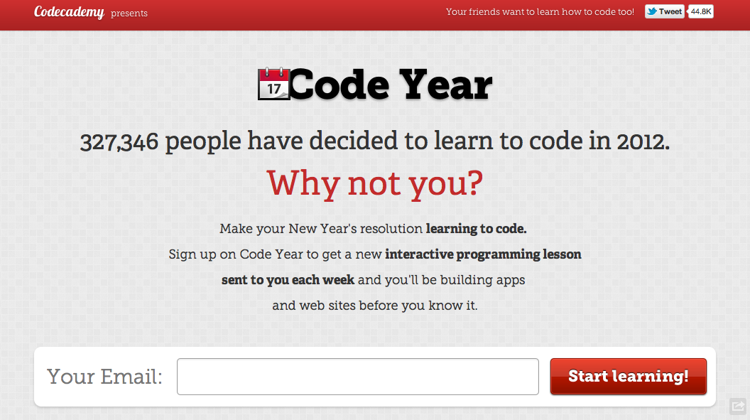ในช่วงต้นปี Codecademy ต้องการขยายฐานข้อมูลผู้ใช้โดยอาศัยวิธีง่ายๆ กับโครงการ “CodeYear” คือ การนำเสนอบทเรียนใหม่ทุกสัปดาห์ตลอดปี 2012 ส่งตรงถึงผู้ที่สนใจเพียงกรอกอีเมลไว้ให้ก็พอ ภายในระยะเวลาเพียงแค่ 2 วันก็มีคนเข้ามาสมัครสูงถึง 1 แสนรายเลยทีเดียว
