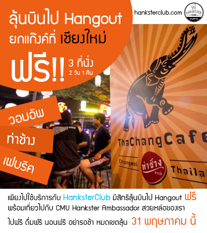 พิเศษสำหรับช่วงนี้ สำหรับใครที่ใช้บริการ HanksterClub ภายในเดือนพฤษภาคม ทีมงานฝากมาบอกว่า มีสิทธิ์ลุ้น เป็น Gang แรกที่จะได้ไป Hangout with HanksterClub at Changmai พร้อมตั๋วเครื่องบินไปกลับกรุงเทพฯ – เชียงใหม่ 3 ที่นั่ง ฟรี!!!!!!!!!!!!! สำหรับใครที่สนใจสามารถเข้าไปสมัครได้ที่ HanksterClub เลย!