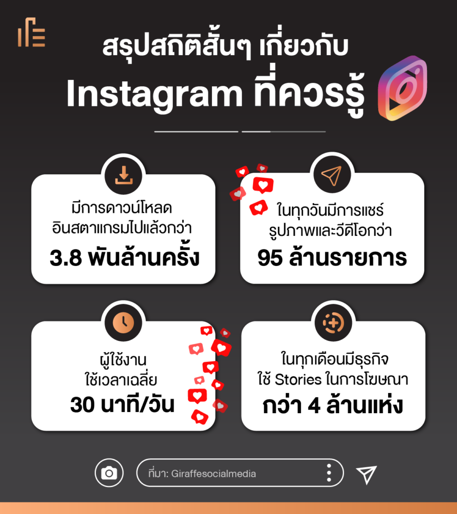 - มีการแชร์รูปภาพและวีดีโอกว่า 95 ล้านรายการทุกวัน